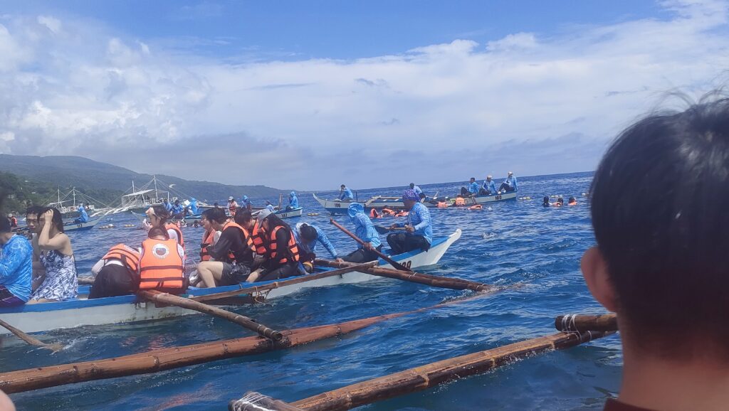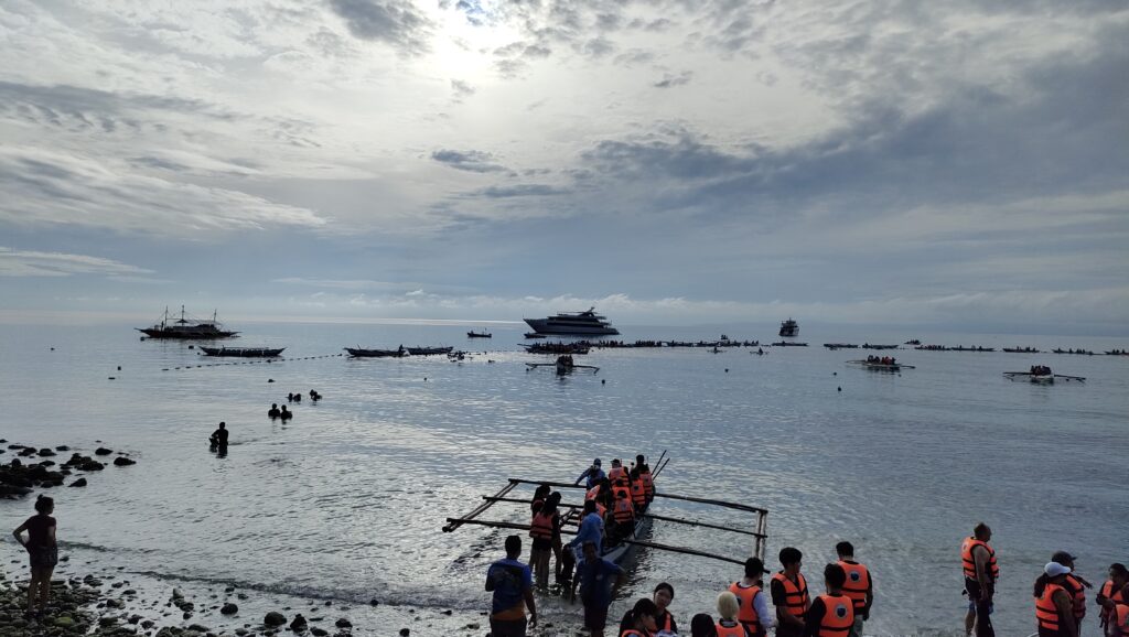 ライフジャケットを着て船に乗り込む。船は浜からほんの少しの距離に弧を描く様に展開していて、この内側、浜辺の方向に竹のイカダを突き出している。餌をまく船が弧の内側に沿って行ったり来たりすることで、ジンベエザメを見るチャンスを作ってくれている。