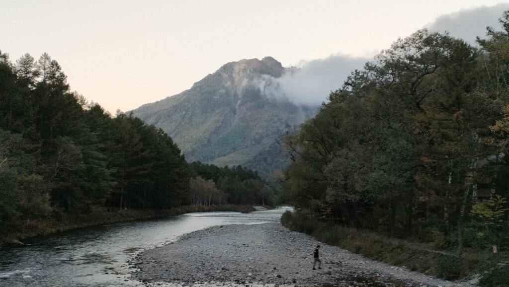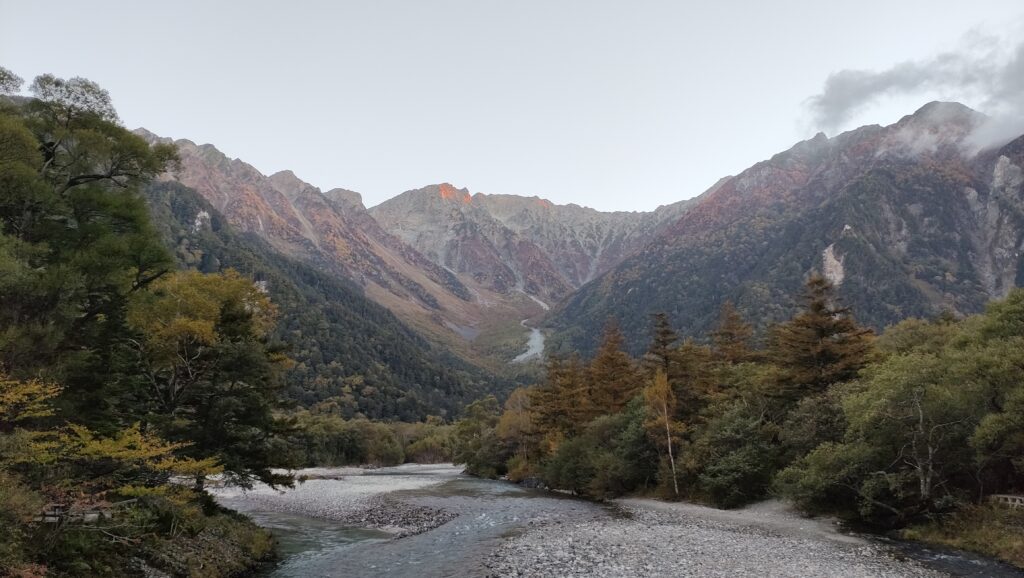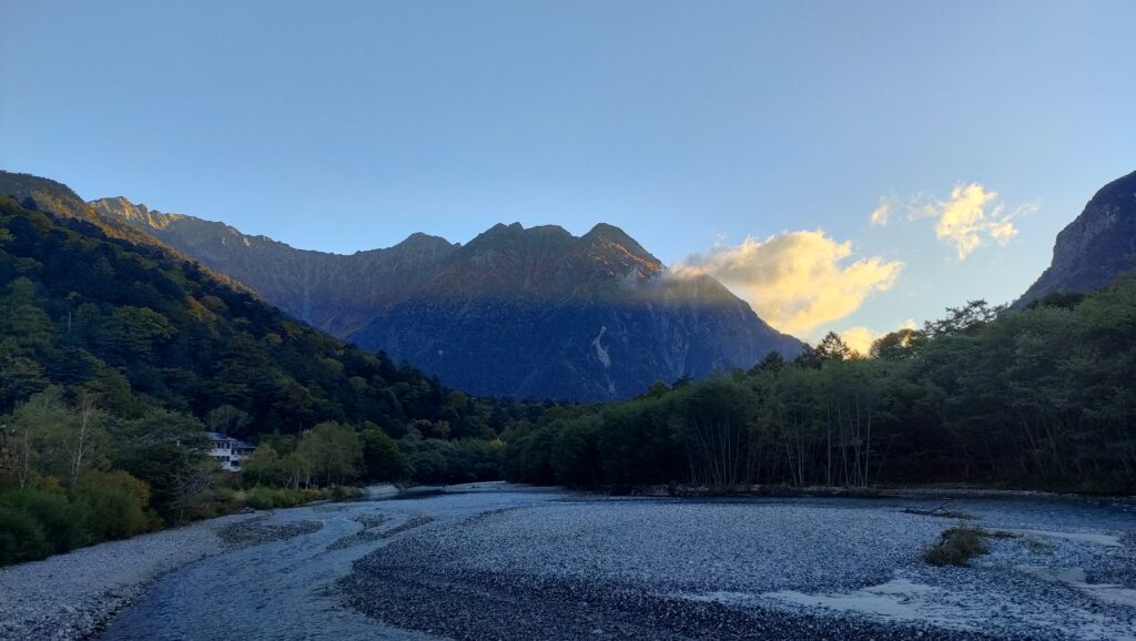 真っ暗なうちに夜行バスで到着、紅葉の当たり年でたくさんの人が訪れていた。河童橋からは見事に色づいた穂高岳の先に朝日が当たっていた。