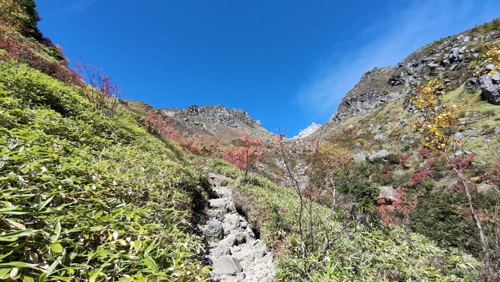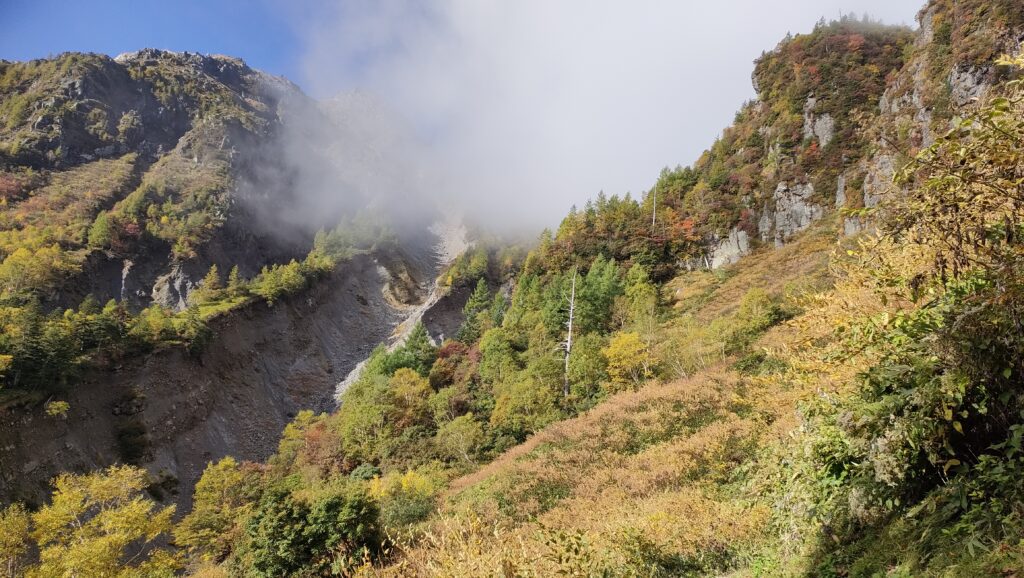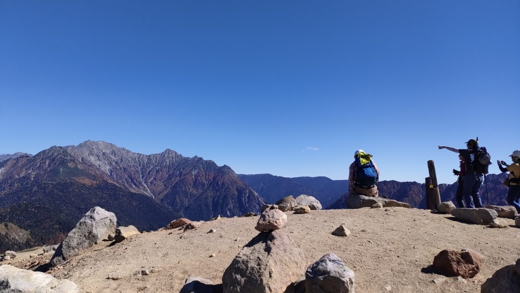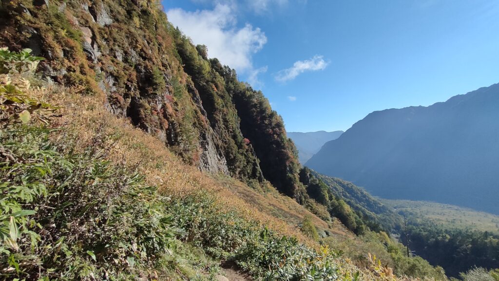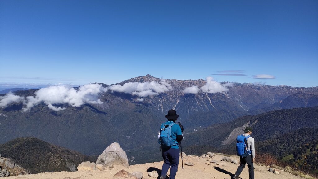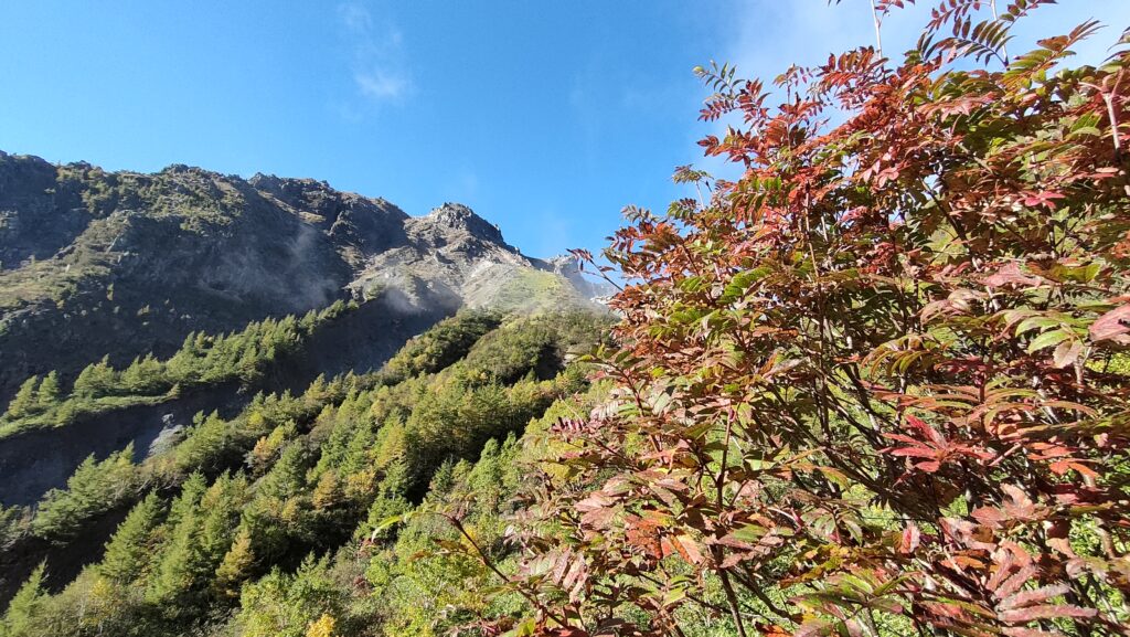 穂高岳に背を向けて、焼岳へ歩き出す。周りより標高が低めで縦走にも組み込みにくいことから、秋の日帰りに向いていると思う。