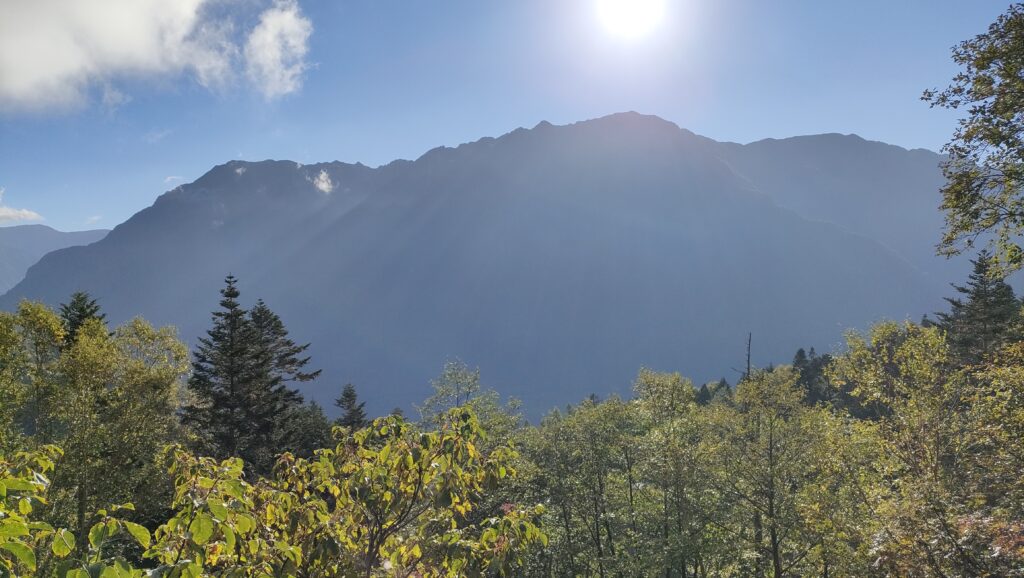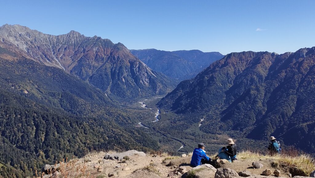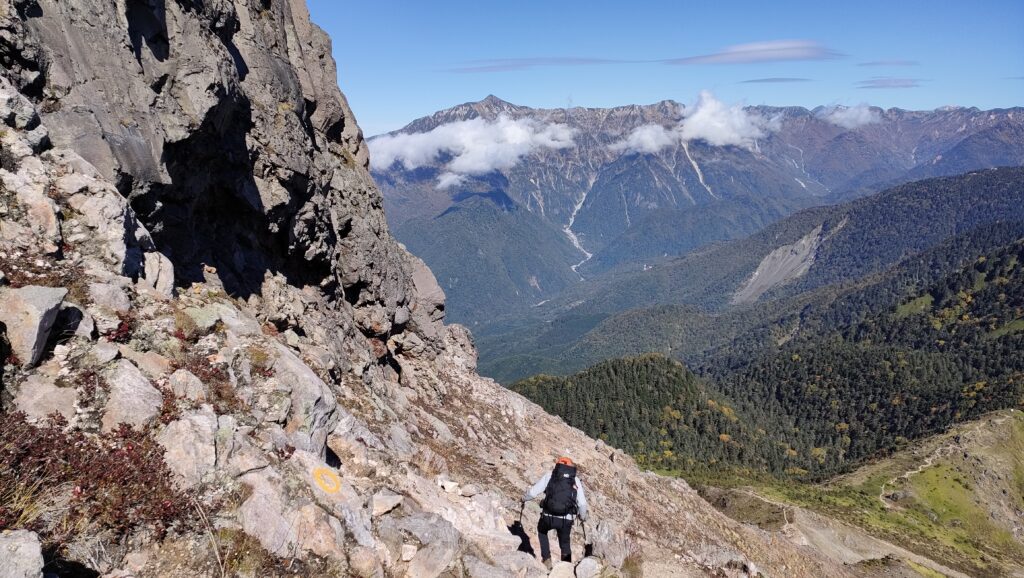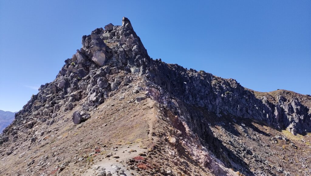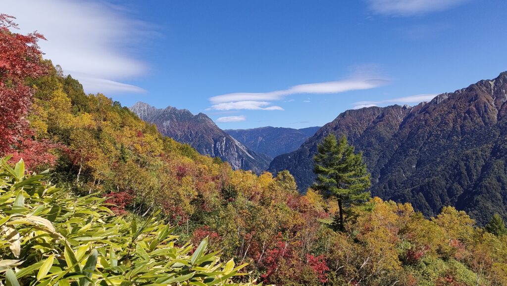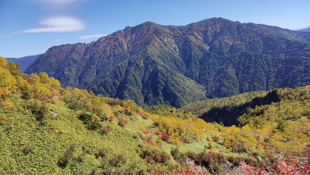 穂高岳に背を向けて、焼岳へ歩き出す。周りより標高が低めで縦走にも組み込みにくいことから、秋の日帰りに向いていると思う。