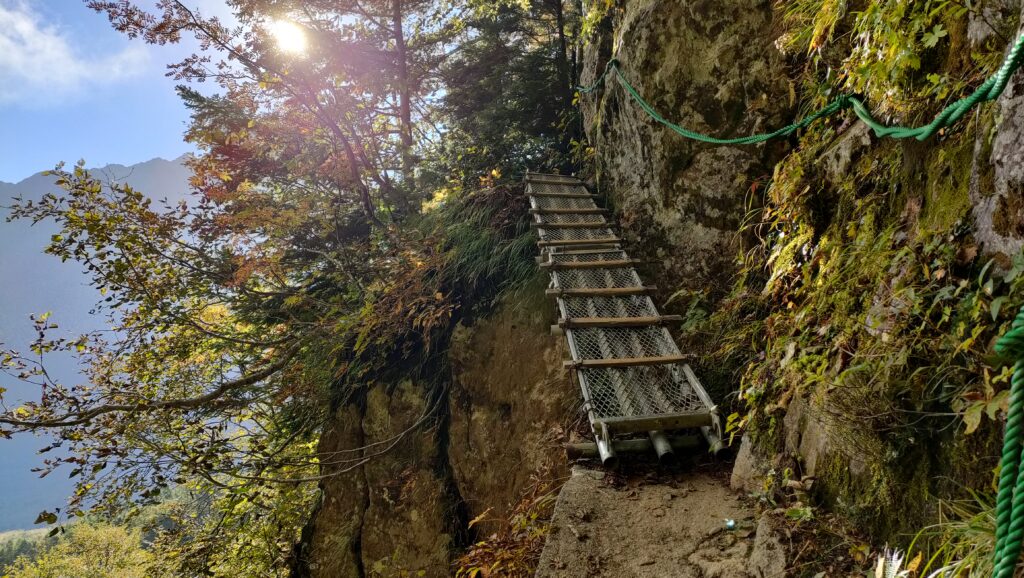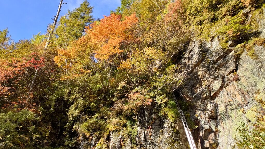 崖沿いの橋を渡ると、視界が開けた。案外紅葉は進んでいなくて、ちょっと残念。