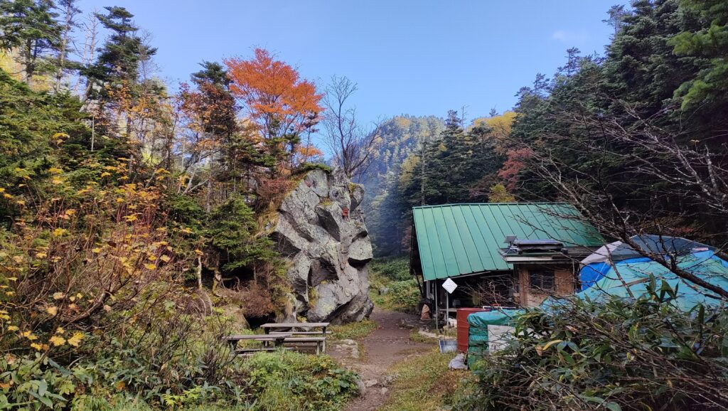 焼岳小屋に到着。こぢんまりとした小屋だ。林と岩に東西から挟まれた日陰になっていて寒い。