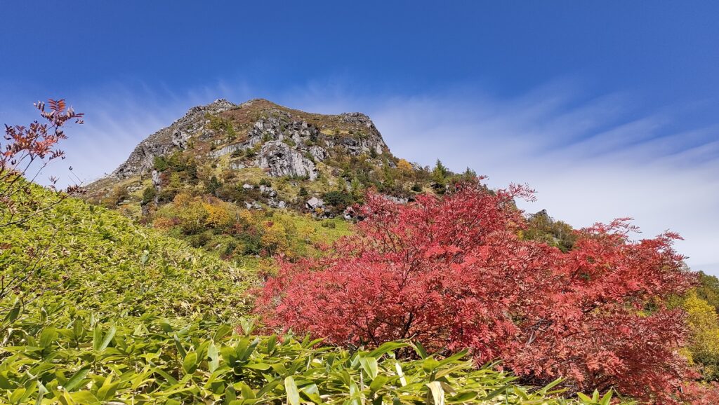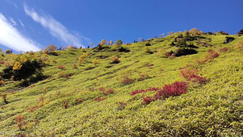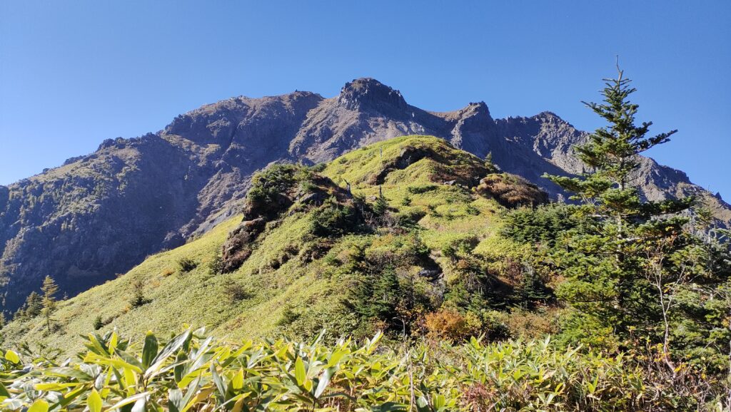 小屋からすぐ尾根に出ることができた。きれいな笹の小山の向こうに岩むき出しの焼岳が見える。