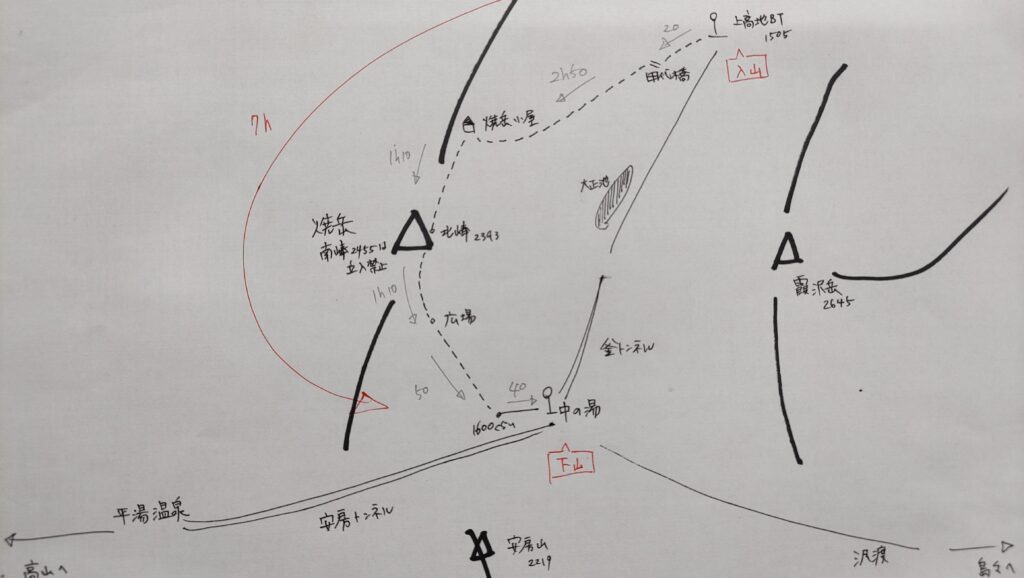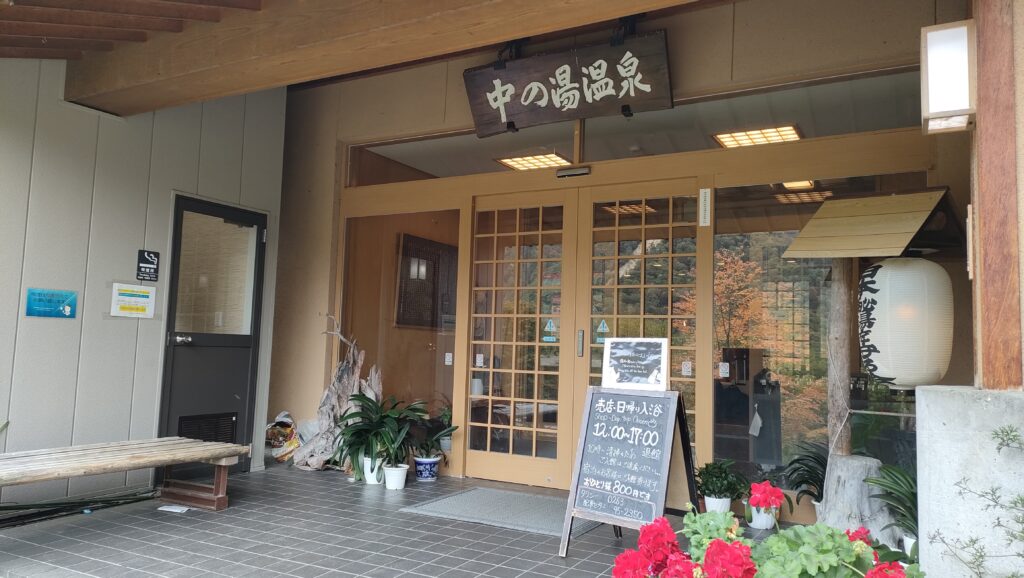 広場からは急な道を延々と下り、中の湯で硫黄の香りがする温泉を楽しんだ。