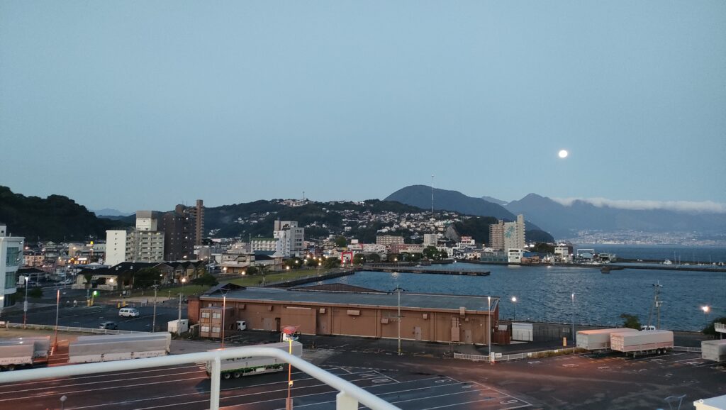 6時半、大分港着。まだ陽は昇らず、大きな満月が町を照らしていた。
