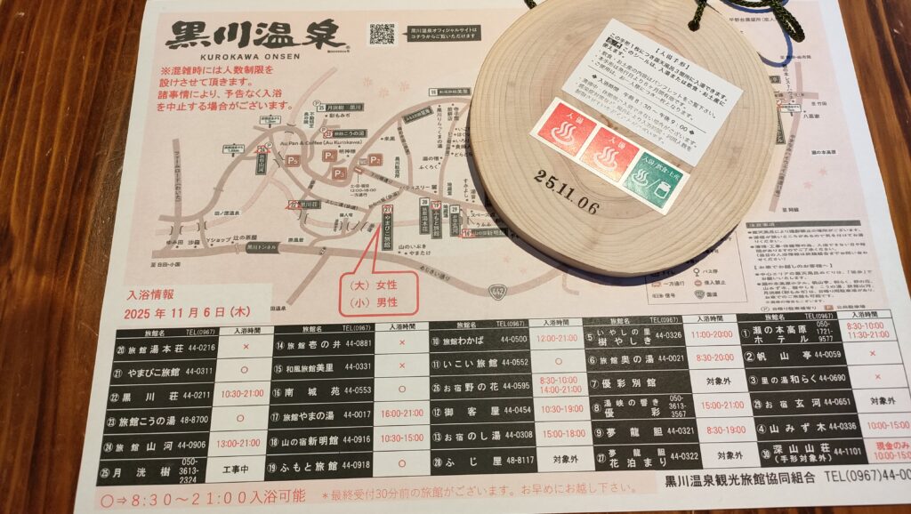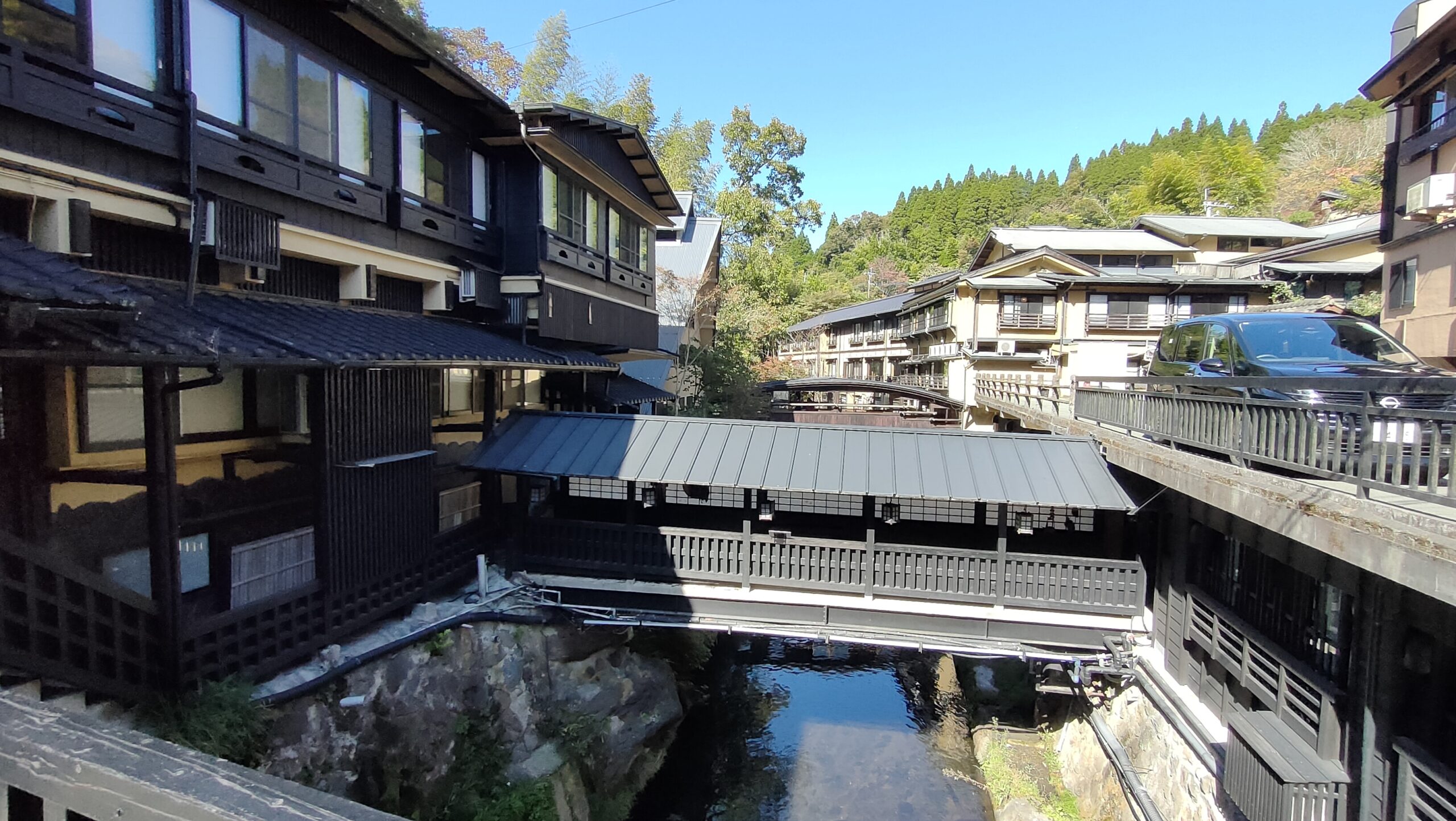 くじゅう連山の側を通るやまなみハイウェイを抜けて、黒川温泉に到着。谷筋に30程の温泉宿が密集した狭い集落で、入湯手形を1,500円で買うと3か所の日帰り露天風呂を利用できる。