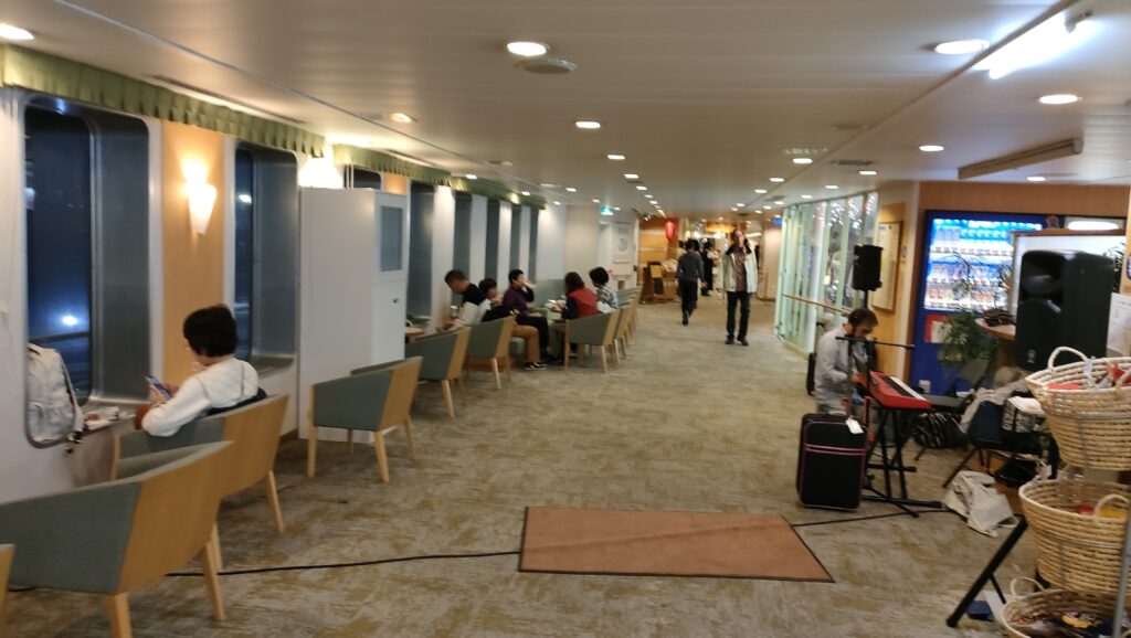 週の真ん中ということもあり、観光客らしき人は少なく、乗り慣れた人ばかりのようだ。窓際のソファを確保して弁当を食べる人と、足早にお風呂に向かう人に分かれ、バイキングに向かう人はまばらだ。3年前1,500円、今は2,000円、インフレを感じる。